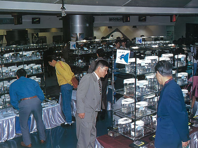 ③ 諸外国からの審査員も加えた審査員団により審査される国内グッピーコンテスト、